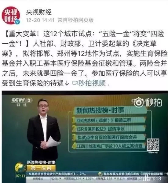 01、重磅!五險(xiǎn)將變?yōu)樗碾U(xiǎn) 早在2016年,國務(wù)院就對(duì)重慶、內(nèi)江、昆明、岳陽、鄭州、威海、合肥、泰州、沈陽、邯鄲、晉中這12個(gè)城市進(jìn)行試點(diǎn),實(shí)施生育保險(xiǎn)并入醫(yī)療保險(xiǎn)基金征繳和管理,試點(diǎn)時(shí)間為:2年。