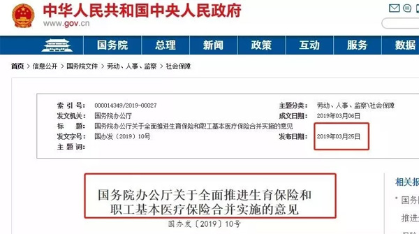 2019年3月月15日,國務(wù)院正式發(fā)布《關(guān)于全面推進(jìn)生育保險(xiǎn)和職工基本醫(yī)療保險(xiǎn)合并實(shí)施的意見》(國辦發(fā)〔2019〕10號(hào)),意見指出,2019年底前實(shí)現(xiàn)兩項(xiàng)保險(xiǎn)合并實(shí)施。
