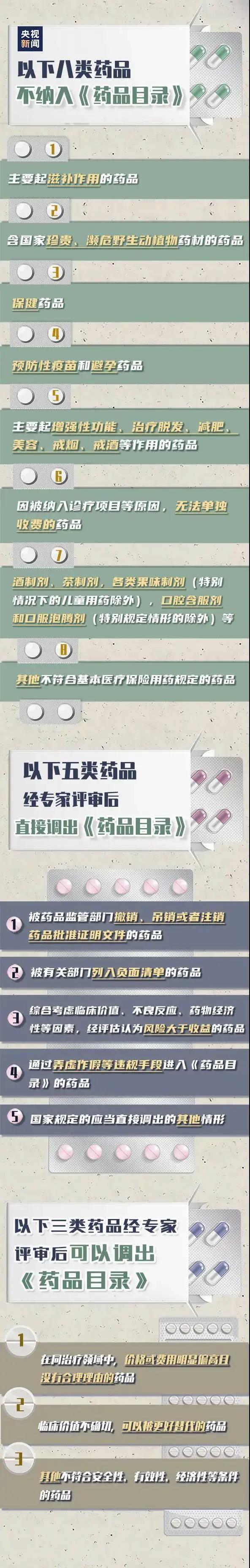 另外辦法明確了包括預防性疫苗,滋補藥品,保健藥品,脫發、美容減肥類等在內的八類不得進入《藥品目錄》的藥品;規定了醫保基金的支付辦法等。 日常就醫問藥時 還有哪些藥品不可報銷? 藥品調入、出《藥品目錄》的標準是啥? 哪些可以用醫?;鹬Ц? 一圖了解↓