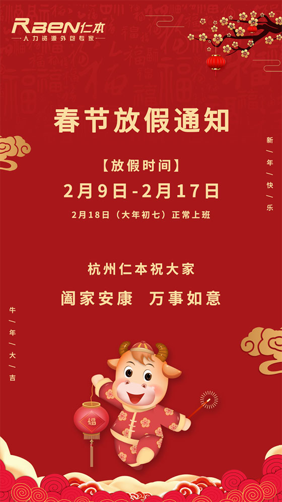 致全體客戶、派遣員工: 春節(jié)將至,忙忙碌碌的一年即將過去,馬上就要迎來全新的辛丑牛年!首先向各位仁本的合作伙伴和全體員工致以節(jié)日的問候。 杭州仁本春節(jié)假期為: 2021年2月9日——2021年2月17日 2月18日(大年初七)正式上班 春節(jié)防疫溫馨提示 1、盡量減少外出活動(dòng),避免去疾病正在流行的地區(qū)、減少春節(jié)期間走親訪友聚餐、減少到人員密集的公共場所活動(dòng)。 2、走親訪友要注意:少走親少訪友,不擁抱不握手,快見面快回走。 3、主動(dòng)做好個(gè)人與家庭成員的健康監(jiān)測,出現(xiàn)發(fā)熱、咳嗽、乏力等癥狀,應(yīng)主動(dòng)戴上口罩及時(shí)就近就醫(yī)。 最后杭州仁本全體員工祝大家: 新春快樂,闔家幸福。 牛年,牛氣沖天,牛轉(zhuǎn)乾坤! |