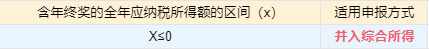 對小明來說,兩種計稅方式下,年終獎選擇單獨申報更有利,到手的年終獎多了5100元。 但并不是所有的情況都適合單獨申報,具體可以分為以下情況: (1)當年收入(含年終獎)減去6萬及三險一金、附加扣除等后應納稅所得額≤0