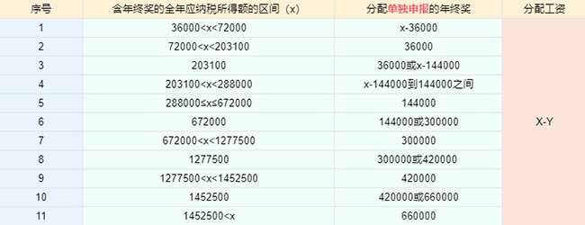 年終獎選擇兩種方式都可以。 (3)當年收入(含年終獎)減去6萬及三險一金、附加扣除等后應納稅所得額>36000 當含年終獎的全年應納稅所得額大于36000時,由于年終獎單獨申報存在雷區(qū)等原因,為使稅負最低,可在年終獎和工資之間進行分配,分配的年終獎按照全年一次性獎金單獨申報。