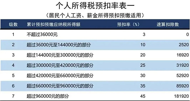 3、綜合所得稅率表(個稅匯算清繳時適用) 綜合所得是指居民個人取得的工資、薪金所得;勞務報酬所得;稿酬所得和特許權使用費所得,適用百分之三至百分之四十五的超額累進稅率(預扣率表見前述一、二)。