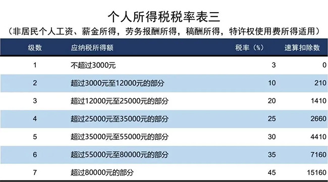 非居民個人的工資、薪金所得,以每月收入額減除費用五千元后的余額為應納稅所得額;勞務報酬所得、稿酬所得、特許權使用費所得,以每次收入額為應納稅所得額。 勞務報酬所得、稿酬所得、特許權使用費所得以收入減除百分之二十的費用后的余額為收入額;其中,稿酬所得的收入額減按百分之七十計算。 5、經營所得稅率表