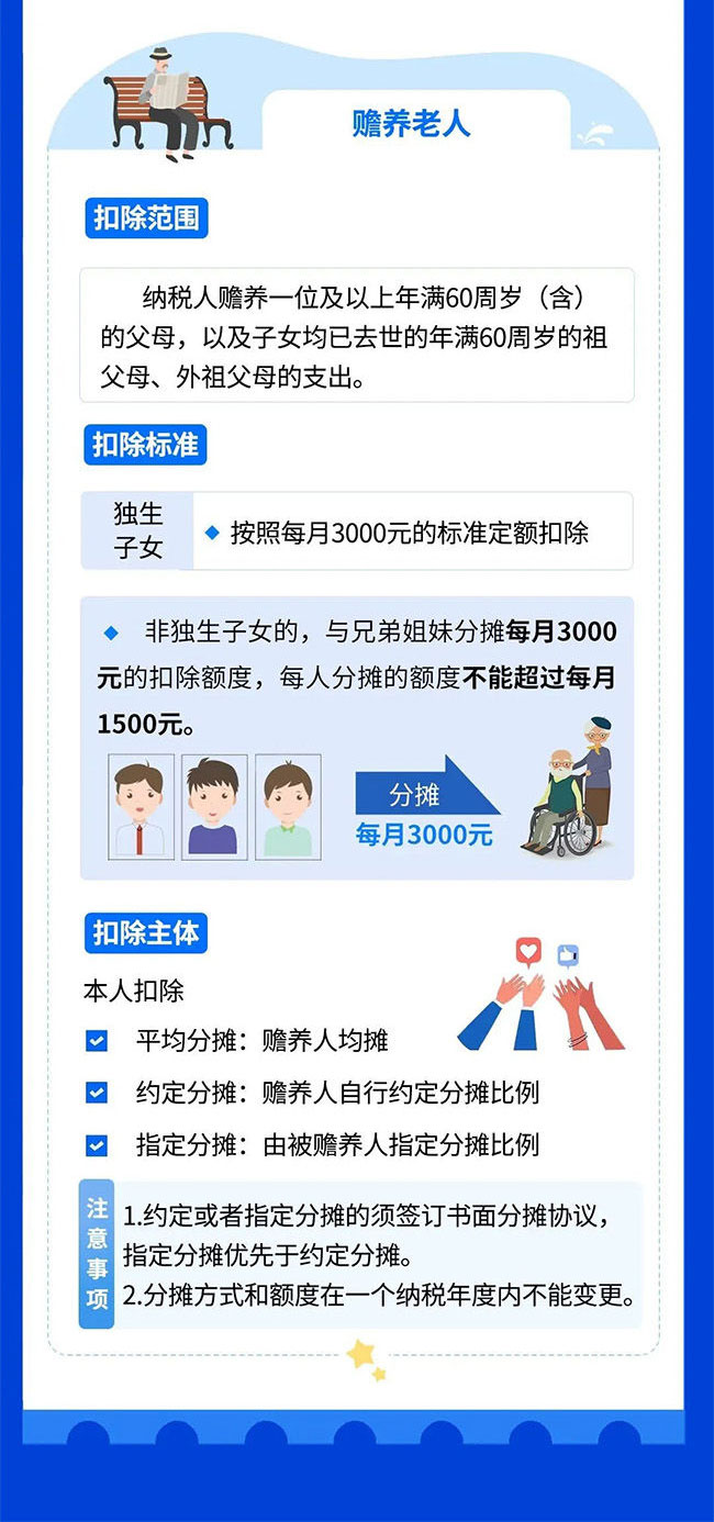 政策內容: 一、3歲以下嬰幼兒照護專項附加扣除標準,由每個嬰幼兒每月1000元提高到2000元。 二、子女教育專項附加扣除標準,由每個子女每月1000元提高到2000元。 三、贍養老人專項附加扣除標準,由每月2000元提高到3000元。其中,獨生子女按照每月3000元的標準定額扣除;非獨生子女與兄弟姐妹分攤每月3000元的扣除額度,每人分攤的額度不能超過每月1500元。 四、3歲以下嬰幼兒照護、子女教育、贍養老人專項附加扣除涉及的其他事項,按照《個人所得稅專項附加扣除暫行辦法》有關規定執行。 五、上述調整后的扣除標準自2023年1月1日起實施。 專項附加扣除每個月標準提高,意味著能夠享受上述扣除的納稅人,可以扣除更多的應納稅額,從而少交個稅,增加到手收入。 那么,調整后,每個人到底可以增加多少收入?這跟每個人的具體情況息息相關。 02、到底能增加多少收入? 由于目前一年個稅起征點(基本減除費用)為6萬元,再疊加7項專項附加扣除等各類扣除項目,實際起征點更高。 對于無需繳納個稅的人群,“一老一小”扣除標準提高與否,對他們并無影響。真正影響的是繳納個稅且有老人孩子的納稅人。 對于這些人而言,假如有兩個孩子,“一老一小”扣除標準每月提高1000元,最高能比之前多享受每月3000元個稅扣除額,一年則是36000元。如果該人適用最高的45%個稅邊際稅率,那么,理論上可享受1.62萬元個稅減稅額。當然,如果有更多的孩子,可以享受更高的扣除額度,到手收入會更高。 不過,贍養岳父母或公公婆婆是不能享受贍養老人專項附加扣除的。根據現行政策規定,贍養老人專項附加扣除政策中的老人(被贍養人),是指年滿60歲的父母,以及子女均已去世的年滿60歲的祖父母、外祖父母,不包括配偶的父母。 03、最全個人所得稅扣除項目
