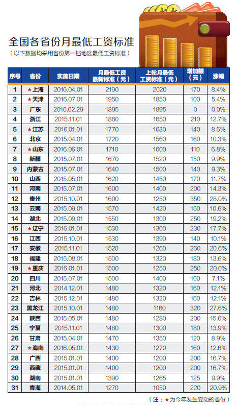 你所在的省份最低工資標準還調整嗎?凡是跟錢有關的政策調整很多人都很關注。據記者查閱公開報道統計,截至5月26日,全國已有山東、上海、天津、江蘇、遼寧、重慶、海南等7省份對今年最低工資標準作了明確。 “在當前經濟增速明顯下滑的情況下,可以適當減慢調整最低工資標準的次數,合理降低最低工資標準調整的幅度”,中國勞動學會副會長蘇海南接受記者采訪時表示,“面對經濟增速放緩的形勢,為貫徹中央關于‘降成本’的要求,需要對現行有關規定和做法進行研究調整。” 已有7省份上調最低工資標準,最高最低省份差920元 截至5月26日,已有山東、上海、天津等7省份明確上調最低工資標準,還剩24個省份未宣布上調最低工資標準(見圖表,標紅五角星的是今年調整的省份)。而在過去的2015年,全國至少有28個地區上調最低工資標準,上調的地區數量大大超過2014年。 目前,全國最低工資標準整體的狀況是:上海最低工資標準每月2190元,為全國最高,比位居第二位的天津高出240元,比位列第三位的廣東省高出295元;青海的最低工資標準為1270元,為全國最低。 上海的最低工資標準之所以拔得頭籌,似與經濟總量相關。翻看上海市2015年的GDP總量接近2.49萬億元,比同為直轄市的北京(2015年的GDP總量為2.29萬億元)高出0.2萬億元,相應的,最低工資標準也高出北京470元(北京2015年最低工資標準為1720元)。北京與上海的最低工資標準差距可謂不小。 而上海跟同為直轄市的天津相比,其最低工資標準差距卻沒有北京大。盡管天津2015年的GDP總量只有1.65萬億元,上海高出天津0.84萬億元,而天津2016年的最低工資標準為1950元,上海僅高出天津240元。 同為直轄市的重慶的最低工資標準就更不樂觀了。重慶2015年的GDP總量是1.57萬億元,經濟體量與天津相當,與上海的差距為0.92萬億元,但是重慶2016年的最低工資標準僅為1500元,天津比重慶高450元,上海比重慶高690元。 如果簡單地從經濟總量數據上分析,與上海相比,北京、重慶的最低工資標準都還有上漲的空間。 其實,上海不僅最低工資標準在全國拔得頭籌,最低工資標準的含金量也最高,這里說的含金量是指到手的純收入。上海明確規定,月最低工資標準不包含個人依法繳納的社會保險費和住房公積金;延長法定工作時間的工資;中班、夜班、高溫、低溫、井下、有毒有害等特殊工作環境、條件下的津貼;伙食補貼(飯貼), 上下班交通費補貼, 住房補貼。 值得注意的是,在榜單中,青海省的最低工資標準全國最低,為1270元,與最高的上海相差920元。查看2015年青海省的GDP總量為0.24萬億元,在全國排倒數第二,似乎最低工資跟當地的經濟增速也密切相關。 對此蘇海南告訴記者,各省份在調整最低工資時不僅考慮經濟增長速度,還需綜合考慮包括物價上漲情況、社會平均工資提高以及就業狀況等多種因素。他同時建議,有條件的地方,還是要適時合理提高當地最低工資標準,畢竟這與2013年出臺的《關于深化收入分配制度改革的若干意見》提出的要“促進中低收入職工工資合理增長”的說法相一致;但各地在調整最低工資標準時,一定不能再像有的地方前幾年那樣去與周邊地區搞攀比,一定要把握好度,既要努力保障提供正常勞動的低收入勞動者實際生活不下降,同時要避免給企業形成過大壓力。 各省份調整頻次參差不齊,調整速度減慢 關于最低工資標準,記者統計發現,各省份的調整頻次參差不齊,有些省份是年年調,有些省份是兩年調整一次,還有一些省份已經超過兩年時間,還未進行調整。 從圖表中可以看出,除了2016年已作出調整的7個省份以外,顯示實施日期為2015年的就有22個省份,還有青海和河北目前在實施2014年進行調整的最低工資標準。 記者統計,上海除了2009年暫緩調整最低工資標準外,其余時間都是每年至少調一次。天津、江蘇的最低工資標準也基本維持年年調整的頻率。北京原來一直保持年年調整的頻率,在2014年從每月1560元增加到2015年的1720元之后,截至目前,還沒有進行調整。 江蘇的最低工資標準基本保持一年一調的節奏。上次調整時間是2014年11月1日,距離今年的2016年1月1日僅間隔了一年零一個月。 重慶的最低工資標準是兩年一調。重慶最高一檔是在今年1月1日從2014年1月1日的1250元調整為1500元,增幅為20%,與上一輪次增幅19%基本持平。 青海省以前也保持兩年一調,上次調整的時間是2014年5月1日,距今兩年整。 雖然遼寧今年進行了調整,但是距離上次調整已經間隔了近3年,也成為所有省份中調整間隔最長的。 今年2月29日,廣東省政府發布《廣東供給側結構性改革降成本行動計劃(2016—2018年)》,提出建立與經濟發展水平相適應的最低工資標準調整機制,2016年、2017年最低工資標準暫按2015年5月發布的標準(每月1895元)執行。 不僅各省份的調整頻次參差不齊,調整實施的時間也不統一。記者統計發現,除了2月和6月,2015年的其他月份一個不少。 對此,蘇海南提出建議,“原來制度沒有規定非得是幾月份進行調整,但多數是上半年調,今后要進一步完善調整的時間,需要在年度內定一個調整區間。” 經濟下行企業經營困難,最低工資標準增幅下降 我國現行最低工資標準自2004年3月1日開始實施,此前多年,各地的最低工資標準水平歷經了較大幅度上漲。但是,現階段,中國經濟下行壓力較大,企業效益增長也面臨困難。在當前經濟下行期,考慮