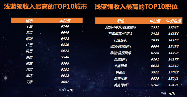 前程無憂近日發布《2018淺藍領白皮書》。白皮書首次定義了“淺藍領”這一職場新群體,主要指基礎白領、城市服務業中的基層管理人員及藍領技術人員。白皮書指出,“淺藍領”年齡結構日趨年輕化,從業者以女性居多(占比54.2%)。不同于傳統藍領月薪集中在5,000元上下,“淺藍領”月薪差異較大,高薪職位已突破萬元。高流動率是該人群的一大特征,六成“淺藍領”在一年內選擇換工作,其中33.7%會在6-12個月內選擇跳槽。 淺藍領構成 與傳統藍領以制造業或建筑業且從事技術含量較低的單一重復性工作不同,“淺藍領”主要分布于城市服務業且從事技術含量相對較高的體力和腦力勞動相結合的工作,大專及以上學歷占比較高,達48.9%。數據顯示,24歲及以下人群是“淺藍領”主要年齡構成,占比達43.3%,其次是25-30歲人群達30.4%。“淺藍領”工作時間偏長已經成為社會普遍現象,38.4%的都市“淺藍領”周工作時長為50-59小時,17.7%的都市“淺藍領”每周工作超過70小時。商務司機、快遞員、房地產中介/置業顧問位列周工作時長前三。 城市淺藍領求人倍率指數 “淺藍領”供需呈現中心城市對周邊區域的“虹吸”效應。一線城市“淺藍領”主要來自周邊省份,非一線城市多來自省內。從招聘規模來看,北上廣深的招聘規模位于第一梯隊,武漢、成都緊隨其后。從求職端來看,“淺藍領”最愿意去的城市為上海,其次為廣州,深圳,成都也較受“淺藍領”歡迎,北京由于實施人口疏解政策,整體生活成本較高,在“淺藍領”求職意向城市中位居第五位。為了對比各城市“淺藍領”崗位緊缺程度,白皮書采用了求人倍率指標,指標顯示,武漢“淺藍領”缺口*大,其次為北京。 淺藍領收入TOP10城市&職位 上海是“淺藍領”收入最高的城市,中位值為6,740元,其次是北京,中位值為6,645元(注:白皮書中月薪指稅前應發工資,包括績效獎金)。非一線城市中,杭州、蘇州“淺藍領”薪酬相對領先。此外,成都、武漢等熱點城市隨著服務業快速發展,“淺藍領”薪酬中位值達到5,000元以上?!皽\藍領”從業者中,房地產中介/置業顧問、汽車銷售/經紀人、門店店長位列前三。業務跟單、快遞員、銷售代表、商務司機等收入也比較亮眼。另外數據顯示,“淺藍領”繳納社會保險意愿整體不高,其中40.5%的“淺藍領”不愿繳納社保,希望足額繳納社保占比為27.4%?!皽\藍領”普遍年輕,職場穩定性較差,更希望獲得更多現金性收入,這亦給企業合規繳納社保帶來一定挑戰。 |