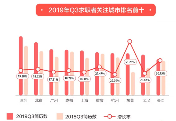 成都則陸續(xù)出臺《引進(jìn)培育交子金融人才實施辦法》《重點項目人才開發(fā)指引(2019)》等政策,吸引高學(xué)歷、高技能人才赴蓉共謀發(fā)展,城市的現(xiàn)代化、國際化水平日益提升,也促進(jìn)企業(yè)招聘更加活躍。 58同城招聘研究院《2019三季度人才流動報告》還反映出,鄭州企業(yè)招聘活躍度同比增幅最大,繼二季度以來繼續(xù)保持第一的位次。作為中原城市群中心的鄭州,位居“新一線城市”榜全國第9名,“中國大陸最佳商業(yè)城市”第12名,持續(xù)提升的城市綜合實力讓更多企業(yè)聚集于此,招聘熱度不斷提高。 《2019三季度人才流動報告》對部分城市求職情況進(jìn)行了分析。其中,深圳是求職者最關(guān)注的城市,其次是北京、廣州、成都和上海。深圳作為改革開放的高地和粵港澳大灣區(qū)的建設(shè)重鎮(zhèn),產(chǎn)業(yè)發(fā)達(dá)、收入可觀,成為求職者就業(yè)的“天堂”。 而成都在求職關(guān)注度上超過上海,與其大力度的人才政策不可分割,2017年7月,成都出臺《實施人才優(yōu)先發(fā)展戰(zhàn)略行動計劃》,2年來吸引28.6萬本科及以上人才落戶,充實了成都的“求職大軍”。 在求職者關(guān)注度增幅上,東莞以51.25%的增長值一騎絕塵,其次是長沙、杭州和武漢。由于東莞位于粵港澳大灣區(qū),收入水平高、發(fā)展?jié)摿Υ螅畛杀镜陀谏钲凇V州等城市,受到了眾多求職者的青睞。近年來,長沙出臺“人才政策22條”,杭州發(fā)布《關(guān)于加快推進(jìn)杭州人才國際化的實施意見》,武漢發(fā)起“四大資智聚漢工程”,吸引精英人才共促區(qū)域發(fā)展,進(jìn)一步提高了當(dāng)?shù)氐那舐殶岫取?/span>