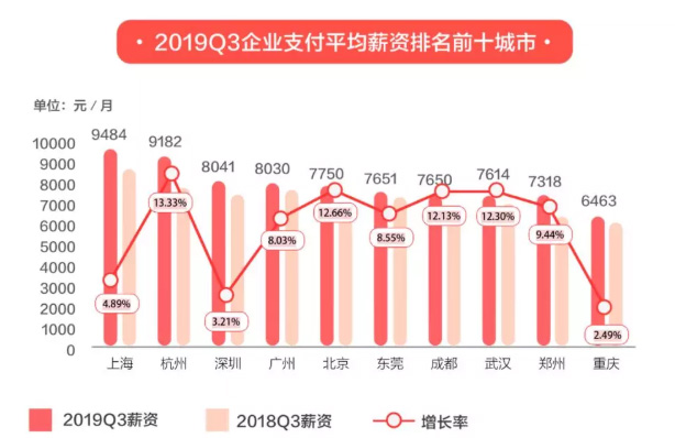 上海企業(yè)平均支付月薪達(dá)9484元,杭州薪資同比增幅最高 58同城招聘研究院《2019三季度人才流動報告》顯示,2019年三季度,企業(yè)支付薪資均有一定程度的上漲。其中,上海企業(yè)平均支付月薪達(dá)9,484元,排名第一,其次是杭州、深圳和廣州。上海是全國傳統(tǒng)的經(jīng)濟(jì)中心,人均GDP突破2萬美元,優(yōu)秀人才為上海企業(yè)創(chuàng)造了巨大的財富,而企業(yè)也將這些價值以高薪形式返還給人才。