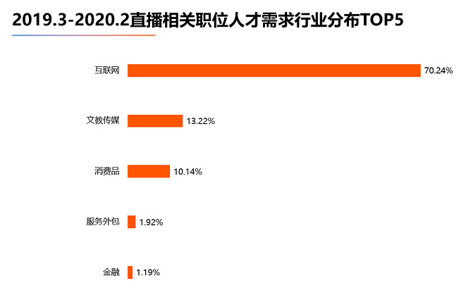 2019年3月-2020年2月,在直播類職位人才需求占比最高的前5個城市中,北京以26.52%的占比位居榜首。“千年商都”廣州與素有電商大本營之稱的杭州并列第二,人才需求占比均為15.91%。上海以14.75%的占比緊隨其后。深圳則以7.96%的占比擠入前五。 北京作為創新創業的集聚地,是國內眾多知名直播、短視頻類公司的所在地。如抖音、快手、映客、花椒直播等都將公司總部設在北京,因此北京對直播類人才需求最旺盛。而杭州作為我國電商行業的大本營,以及有阿里的坐鎮,對直播帶貨類人才的需求一直以來都較為旺盛,超過半數淘寶機構都在杭州,淘寶直播的產業鏈上下流催生了大量相關崗位需求。“千年商都”廣州自2019年起開始化身“直播之城”,當地的服裝、旅游、美食等越來越多行業從業者在直播間里找到源源不斷的消費者。 2、行業人才需求分布:互聯網占據主導地位,直播類職位人才需求占比超70%