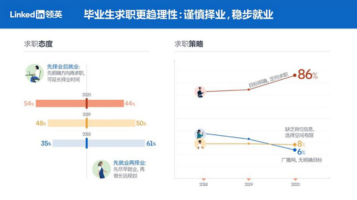 ? 近日,領英針對畢業生展開調研,并發布《2020年應屆畢業生求職趨勢洞察》,探究他們當下的求職心態、求職目標,以及在各種不確定因素下,進行求職選擇時所面臨的挑戰。盡管有些企業暫緩發布校招職位,有些行業職位縮減;盡管無法進行現場招聘和面試為求職帶來不便,但結合在線直播的云校招和職場社交平臺也為畢業生搭建了一個遠程的360度全景空間,幫助他們連接職場,為職業啟程保駕護航。 “云校招”唱主角,畢業生最需要“個性化職位資訊”和“云面試技巧” 領英平臺顯示,在疫情爆發初期,相對于中高級職位,初級職位的發布數量比去年同期顯著減少。而從企業招聘端實際需求來看,很多企業HR表示校招職位的總體數量基本保持不變,但企業也在根據疫情形勢不斷調整校招的策略、職位發布時機和招聘形式等,這的確為校招帶來了很多不確定性。 調查顯示,50%的畢業生認為就業比往年困難,但從心態上來看,46%的畢業生心態平和,28%表示焦慮。他們當前面臨的最大挑戰首先是缺乏面試技巧(41%),特別是遠程在線面試技巧;其次是獲取職位信息的渠道有限(32%),尤其是精準找到適合自身的目標公司和職位,第三是缺少職場人脈資源(31%),進行經驗分享或內推機會。 調研中,畢業生也認為特殊時期有產生一些利好的機會,首先是求職形式更加多元化且效率更高(62%的受訪者選擇此項),如在線面試和直播招聘等;其次是學校和企業等社會各界都在各盡所能提供求職信息(61%的受訪者選擇此項)。 畢業生求職首選雇主品牌形象而非薪資,汽車/旅游/餐飲行業受冷落 調研顯示,畢業生對雇主品牌形象和企業文化的重視程度近年來逐步提升,對于薪資福利的重視度則逐年降低。2020年畢業生首選的雇主類型為國內知名大廠,其次是外企和國企/央企,受疫情影響小微企業則排名靠后。在充滿不確定的環境下,穩定可靠的雇主品牌成為畢業生的首選。當前最受畢業生青睞的行業是互聯網/電商,以及電子技術/通信,或許受疫情因素和行業大盤綜合影響,汽車和旅游/餐飲成為受畢業生冷落的行業。 求職趨于理性,畢業生選擇謹慎擇業穩步就業 領英調研發現,今年畢業生呈現出謹慎擇業、穩步就業的求職趨勢,54%的畢業生表示會考慮適當延長擇業時間,希望先明確發展方向再就業,這一比例相比過去兩年均有提升。面對當前就業市場的一系列變化和不確定性,畢業生求職的過程更加理性,與其為急于解決就業問題而盲目開啟一份工作,不如先做足充分的準備,明確最適合自身的發展方向,再穩步求職。在今年校招進度整體放緩的情況下,加之延長畢業時間、鼓勵見習等政策的推出也給畢業生謹慎擇業提供了更充足的先決條件。在相應的求職策略上,86%的畢業生表示求職時有明確的目標公司和職位,而不再是廣撒網式的海投方式。37%的畢業生表示如果畢業前沒能找到理想的工作,畢業后會選擇實習或見習的方式增強自身競爭力,穩步進入職場。 為了增強畢業時擇業的能力,高校生職業規劃的需求逐年增強。參與調研的2020畢業生中,有70%的人表示從進入大學開始,甚至入學前就已經開始了職業規劃,這一比例也明顯高于2019和2018年畢業生。已有1-2年工作經驗的2019和2018年畢業生中,有80%表示如果能夠重新選擇,自己會在進入大學甚至更早就開始職業規劃。 幫助職業規劃最重要的途徑,畢業生首選的是參加職業規劃輔導類活動(30%)和實習經歷(27%),在來自985/211高校的畢業生中,有半數表示自己有3段以上的實習經歷。另外,拓展職場人脈成為另一“加分變量”。通過調研有1-2年職場經驗的2019和2018年畢業生后發現,他們認為如果重新進行職業規劃的準備,他們會更加重視關注職場意見領袖(提升12%)和拓展職場人脈(提升11%)。 |