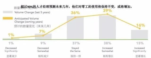 凱利《零工經濟報告》表明:全球有65%的企業在雇傭或使用零工,并有超過90%的人才經理預測,未來幾年里,他們對零工的使用將保持不變,甚至還將進一步增加。 中國人民大學教授彭劍鋒教授認為:數字化、智能化時代,組織和人的關系發生了根本性變化,這是靈活用工爆發的基礎。 未來,靈活用工的空間與價值,持續增長! |