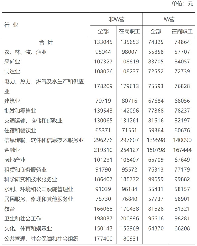 近日,2023年浙江省單位就業人員年平均工資出爐來看看哪些行業最賺錢? 1、2023年浙江省單位就業人員年平均工資 2023年浙江省: 非私營單位就業人員年平均工資為133045元,比2022年度增加4220元,增長3.3%,扣除價格因素,實際增長3.0% 私營單位就業人員年平均工資為74325元,比上年增加2391元,增長3.3%,扣除價格因素,實際增長3.0% 2、2023年度單位就業人員分行業年平均工資表 (一)指標解釋 (1)單位就業人員:指在本單位工作,并由單位支付勞動報酬的人員 (2)工資總額:根據《關于工資總額組成的規定》,工資總額是指本單位在報告期內(季度或年度)直接支付給本單位人員的勞動報酬總額。包括計時工資、計件工資、獎金、津貼和補貼、加班加點工資、特殊情況下支付的工資 工資總額是稅前工資,包括單位從個人工資中直接為其代扣或代繳的個人所得稅、社會保險基金和住房公積金等個人繳納部分,以及房費、水電費。 工資總額不論是計入成本的還是不計入成本的,不論是以貨幣形式支付的還是以實物形式支付的,均應列入工資總額的計算范圍 (3)平均工資:是指在報告期內單位發放工資的人均水平計算公式為: (二)統計范圍 轄區內全部非私營和私營法人單位,以及統計上認定的視同法人單位的產業活動單位。 私營法人單位(包括統計上認定的視同法人單位的產業活動單位)具體包括:內資企業中的私營有限責任公司、私營股份有限公司、個人獨資企業和合伙企業。 非私營法人單位(包括統計上認定的視同法人單位的產業活動單位)具體包括:除私營單位以外的內資(包括機關、事業)單位、港澳臺投資和外商投資企業。 工資統計是統計單位的就業人員,而個體就業人員、自由職業者等非單位就業人員不在工資統計范圍內。 (三)調查方法 根據國家統計局制定的《企業一套表統計調查制度》和《勞動工資統計調查制度》,對轄區內規模以上工業、有資質的建筑業、限額以上批發和零售業、限額以上住宿和餐飲業、有開發經營活動的全部房地產開發經營業、規模以上服務業企業工資統計采用全面調查;除上述企業外其他非私營單位和私營法人單位工資統計采用抽樣調查的方法。 3、“平均工資”的提升對我們有哪些主要影響 01 浙江社保繳費基數新上下限與省平工資有關。 我們知道,社保基數上下限是按上年度月社平工資的60%-300%進行核定。這里的變數在于取哪個社平工資,是在崗職工社平工資,還是全社會單位就業人員平均工資,或者是根據非私營和私營單位就業人員加權平均工資的標準。 去年,浙江社保基數上限的核定是依據2022年度浙江省社會年平均工資(按浙江省非私營和私營單位就業人員加權平均工資)的300%確定。下限則根據2021年的浙江省社會年平均工資的60%進行計算。 目前,浙江省統計局公布的數據是2023年浙江省非私營和私營單位就業人員的年平均工資,而非全社會單位就業人員平均工資或加權平均工資,因此暫無法推出新的社保基數。但不管怎樣,平均工資變化,也將影響今年新的社保基數上下限。 02 杭州社保新基數一般什么時候啟用 按往年規則,杭州的社保基數新上下限預計將在7月—12月之間的結算月正式啟用,啟動后,相關部門將對已按預繳基數征收的社會保險費差額多退少補。 03 全國的私營與非私營單位的平均工資是多少? 2024年5月,國家統計局公布了2023年城鎮單位就業人員年平均工資情況。 2023年,全國城鎮私營單位就業人員年平均工資為68340元,比上年增加3103元,名義增長4.8%,扣除價格因素實際增長4.5%。 2023年,全國城鎮非私營單位就業人員年平均工資為120698元,比上年增加6669元,名義增長5.8%,扣除價格因素實際增長5.5%。 |