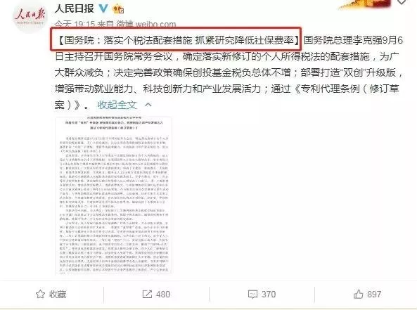 此次會議還決定: 對符合條件的努力穩定就業的參保企業,可通過減費方式,返還企業及其職工繳納的50%失業保險費。 而對符合條件的失業人員,其個人應繳納的基本醫療保險等費用從失業保險基金中列支。 11月2日召開的國務院常務會議,主題是確定進一步促進就業的針對性措施。而人社部此前透露,前三季度城鎮新增就業已完成全年目標任務。 2、降低社保費率,早就開始了 降低社保費率的政策,之前有已經有了,9月初召開的國務院常務會議,要求抓緊研究適當降低社保費率,確保總體不增加企業負擔; 確定落實新修訂的個人所得稅法的配套措施,為廣大群眾減負; 部署打造“雙創”升級版,增強帶動就業能力、科技創新力和產業發展活力;對個人在二級市場買賣新三板股票比照上市公司股票,對差價收入免征個稅;通過《專利代理條例(修訂草案)》。
