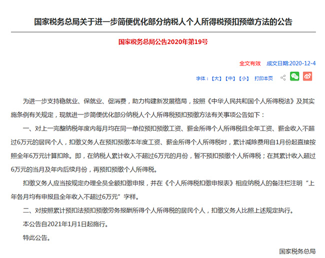 各位老板,HR,財(cái)務(wù)注意了!轉(zhuǎn)念2020年已經(jīng)到了最后一個(gè)月很多稅收,社保,財(cái)務(wù)的政策也在最近陸續(xù)出臺(tái)今天仁本就幫大家匯總近期的各項(xiàng)財(cái)稅政策看看2021年有什么政策變化吧! 中小微企業(yè)注意了 2021年1月起社保費(fèi)全額征收 重點(diǎn)提示:1、中小微企業(yè)注意了,社保免征和緩繳政策執(zhí)行到2020年12月底,2021年1月起應(yīng)繳納的社會(huì)保險(xiǎn)將全額征收! 2、小編了解到,社保由稅務(wù)局征收后,各地社保的申報(bào)和繳納有所不同。目前北京、上海等地是當(dāng)月申報(bào)次月繳納。河北、山西、青島、廈門等地是當(dāng)月申報(bào)當(dāng)月繳納。請(qǐng)各位注意申報(bào)和繳納日期,不要錯(cuò)過申報(bào)和繳費(fèi)哦。 另外,還有一些即將到期的優(yōu)惠政策,老板和會(huì)計(jì)抓緊利用剩余時(shí)間,如果能享受到的話也能為企業(yè)省一大筆錢! 12月31日到期,明年不能享受 需要做稅籌的趕緊看! 增值稅優(yōu)惠 … 1、自2019年2月1日至2020年12月31日,對(duì)企業(yè)集團(tuán)內(nèi)單位(含企業(yè)集團(tuán))之間的資金無償借貸行為,免征增值稅。 如果上述政策到期后,沒有相應(yīng)的延期政策,在12月31日后,企業(yè)集團(tuán)內(nèi)單位之間無償借貸行為,應(yīng)視同銷售,需按貸款服務(wù)繳納增值稅,適用6%的增值稅稅率,且取的專票的不允許抵扣。 2、自2018年9月1日至2020年12月31日,對(duì)金融機(jī)構(gòu)向小型企業(yè)、微型企業(yè)和個(gè)體工商戶發(fā)放小額貸款取得的利息收入,免征增值稅。 3、疫情期間免征增值稅優(yōu)惠政策截止到12月31日。 企業(yè)所得稅優(yōu)惠 … 1、繳2020年所得稅小型微利企業(yè)和個(gè)體工商戶在2020年辦理第三、四季度企業(yè)所得稅預(yù)繳申報(bào)時(shí),可以只申報(bào)不繳稅,應(yīng)繳稅款延緩至2021年1月,同2020年第四季度的稅款一并繳納。 也就是說,符合條件的企業(yè)2020年三、四季度可以不預(yù)扣預(yù)繳所得稅,到2021年再扣。 2、3個(gè)減按15%征收企業(yè)所得稅的地區(qū) (1)西部大開發(fā)企業(yè)所得稅優(yōu)惠 自2011年1月1日至2020年12月31日,對(duì)設(shè)在西部地區(qū)以《西部地區(qū)鼓勵(lì)類產(chǎn)業(yè)目錄》中規(guī)定的產(chǎn)業(yè)項(xiàng)目為主營(yíng)業(yè)務(wù),且其當(dāng)年度主營(yíng)業(yè)務(wù)收入占企業(yè)收入總額70%以上的企業(yè),可減按15%稅率繳納企業(yè)所得稅。 (2)新疆喀什、霍爾果斯 2010年1月1日至2020年12月31日,對(duì)在新疆喀什、霍爾果斯兩個(gè)特殊經(jīng)濟(jì)開發(fā)區(qū)內(nèi)新辦的屬于《新疆困難地區(qū)重點(diǎn)鼓勵(lì)發(fā)展產(chǎn)業(yè)企業(yè)所得稅優(yōu)惠目錄》范圍內(nèi)的企業(yè),自取得第一筆生產(chǎn)經(jīng)營(yíng)收入所屬納稅年度起,五年內(nèi)免征企業(yè)所得稅。 (3)橫琴新區(qū)、平潭綜合實(shí)驗(yàn)區(qū)和前海深港現(xiàn)代服務(wù)業(yè)合作區(qū) 自2014年1月l日起至2020年12月31日止,對(duì)設(shè)在橫琴新區(qū)、平潭綜合實(shí)驗(yàn)區(qū)和前海深港現(xiàn)代服務(wù)業(yè)合作區(qū)的鼓勵(lì)類產(chǎn)業(yè)企業(yè)減按15%的稅率征收企業(yè)所得稅。 上述鼓勵(lì)類產(chǎn)業(yè)企業(yè)是指以所在區(qū)域《企業(yè)所得稅優(yōu)惠目錄》中規(guī)定的產(chǎn)業(yè)項(xiàng)目為主營(yíng)業(yè)務(wù),且其主營(yíng)業(yè)務(wù)收入占企業(yè)收入總額70%以上的企業(yè)。 提醒:適用上述優(yōu)惠政策的單位,12月31日前務(wù)必實(shí)時(shí)關(guān)注是否有新的政策; 如果上述政策到期后,沒有相應(yīng)的延期政策,企業(yè)需要評(píng)估一下是否繼續(xù)利用稅收洼地進(jìn)行籌劃。 個(gè)人所得稅優(yōu)惠 … 2項(xiàng)免征個(gè)稅收入2020年12月31日到期。 疫情防控津補(bǔ)貼對(duì)參加疫情防治工作的醫(yī)務(wù)人員和防疫工作者按照政府規(guī)定標(biāo)準(zhǔn)取得的臨時(shí)性工作補(bǔ)助和獎(jiǎng)金 單位發(fā)放的預(yù)防新冠肺炎的防護(hù)用品單位發(fā)給個(gè)人用于預(yù)防新型冠狀病毒感染的肺炎的藥品、醫(yī)療用品和防護(hù)用品等實(shí)物 車輛購(gòu)置稅 … 1、自2018年1月1日至2020年12月31日,對(duì)購(gòu)置新能源汽車免征車輛購(gòu)置稅。 2、自2016年1月1日起至2020年12月31日止,對(duì)城市公交企業(yè)購(gòu)置的公共汽電車輛免征車輛購(gòu)置稅。 印花稅優(yōu)惠 … 自2018年1月1日至2020年12月31日,對(duì)金融機(jī)構(gòu)與小型企業(yè)、微型企業(yè)簽訂的借款合同免征印花稅。 政策早知道 2021年開始的新政策! 1、個(gè)稅預(yù)扣預(yù)繳方法變了,部分年累計(jì)收入不足6萬的人到手工資將變多 兩類納稅人,自1月起,累計(jì)扣除費(fèi)用直接按照6萬元計(jì)算。 一、上一完整納稅年度各月均在同一單位扣繳申報(bào)了個(gè)稅且全年工資薪金收入不超過6萬元的居民個(gè)人。 需要同時(shí)滿足以下3個(gè)條件:1、上一個(gè)納稅年度1-12月均在同一單位任職且預(yù)扣預(yù)繳申報(bào)了工資薪金所得個(gè)人所得稅。 2、上一納稅年度1-12月累計(jì)的工資薪金收入(包括全年一次性獎(jiǎng)金等各類工資薪金所得,且不扣減任何費(fèi)用及免稅收入)不超