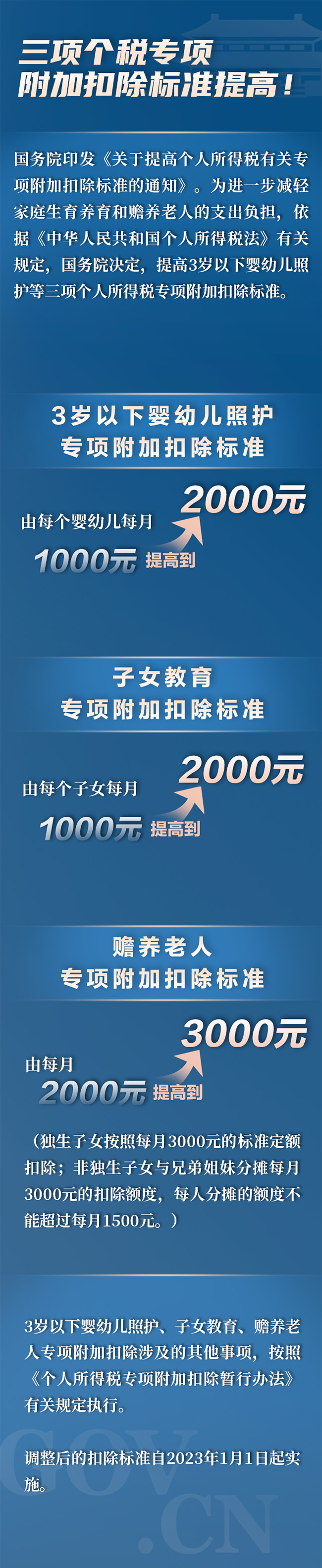 關于提高個人所得稅有關專項附加扣除標準的通知 8月28日,為進一步減輕家庭生育養育和贍養老人的支出負擔,依據《中華人民共和國個人所得稅法》有關規定,國務院決定,提高3歲以下嬰幼兒照護等三項個人所得稅專項附加扣除標準。 為進一步減輕家庭生育養育和贍養老人的支出負擔,依據《中華人民共和國個人所得稅法》有關規定,國務院決定,提高3歲以下嬰幼兒照護等三項個人所得稅專項附加扣除標準。現將有關事項通知如下: 一、3歲以下嬰幼兒照護專項附加扣除標準,由每個嬰幼兒每月1000元提高到2000元。 二、子女教育專項附加扣除標準,由每個子女每月1000元提高到2000元。 三、贍養老人專項附加扣除標準,由每月2000元提高到3000元。其中,獨生子女按照每月3000元的標準定額扣除;非獨生子女與兄弟姐妹分攤每月3000元的扣除額度,每人分攤的額度不能超過每月1500元。 四、3歲以下嬰幼兒照護、子女教育、贍養老人專項附加扣除涉及的其他事項,按照《個人所得稅專項附加扣除暫行辦法》有關規定執行。 五、上述調整后的扣除標準自2023年1月1日起實施。