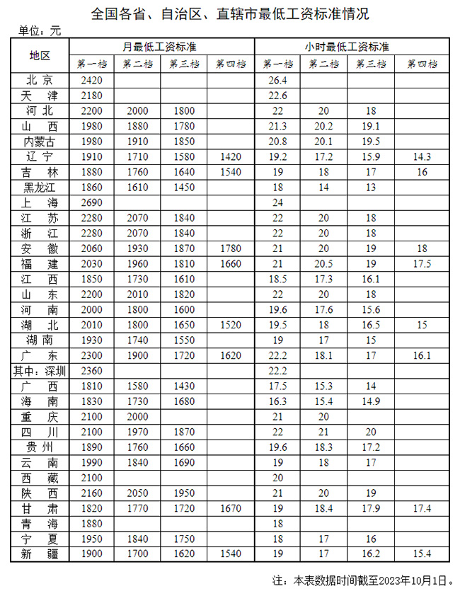 2023年馬上就要結束了,企業又到一年一度的調薪時間,那你的工資有沒有漲呢? 近期,多地人社官方發布2023年企業工資指導線以及最新工資標準,官方喊話到手工資要漲了! 人社官方發布最低工資標準 2023年11月起,強制執行 看完上述的文章,肯定有小伙伴吐槽:既然企業工資指導線只作為參考數據,不是強制執行,那也沒什么意義? 那你可要注意了! 近期,人社部也發布了最低工資標準,是強制執行的,月薪低于這個數,就是違法!