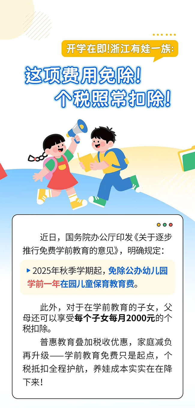 開學在即,浙江有娃一族注意啦,2025年秋季學期起,公辦幼兒園學前一年在園兒童,保育教育費將免除,但個稅將照??鄢?具體內容,一起來看: