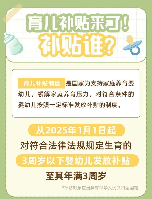 國務院辦公廳8月5日印發《關于逐步推行免費學前教育的意見》,明確從2025年秋季學期起,免除公辦幼兒園學前一年在園兒童保育教育費,相應減免民辦幼兒園保育教育費。 一、免保育教育費對象 從2025年秋季學期起,免除公辦幼兒園學前一年在園兒童保育教育費。 對在教育部門批準設立的民辦幼兒園就讀的適齡兒童,參照當地同類型公辦幼兒園免除水平,相應減免保育教育費。 西藏,四川、云南、甘肅、青海四省涉藏州縣,新疆喀什、和田、阿克蘇、克孜勒蘇柯爾克孜四地州等地區在園兒童繼續執行現行政策。 二、免保育教育費標準 按照縣級以上地方人民政府及其教育、價格主管部門批準的公辦幼兒園保育教育費收費標準(不含伙食費、住宿費、雜費等)執行。 民辦幼兒園保育教育費高出免除水平的部分,幼兒園可以按規定繼續向在園兒童家庭收取。 育兒補貼正式全面開放! 3周歲前每孩每年3600元 9月8日,國家衛生健康委舉行新聞發布會。會上介紹,今天開始,育兒補貼申領正式全面開放,可通過支付寶、微信和各省份政務服務平臺線上申領,也可到嬰幼兒戶籍地的鄉鎮政府進行申領。 育兒補貼補貼誰?怎么補?2025年1月1日之前出生、不滿3周歲嬰幼兒補貼怎么發?戳圖讀懂↓↓ 根據方案,從2025年1月1日起,對符合法律法規規定生育的3周歲以下嬰幼兒發放補貼,至其年滿3周歲。補貼對象應當具有中華人民共和國國籍。 換言之,2022年1月1日以后出生的嬰幼兒,無論一孩、二孩、三孩,均可申領育兒補貼。 育兒補貼按年發放,育兒補貼國家基礎標準為每孩每年3600元,至其年滿3周歲。 1.對于2025年1月1日及以后出生的嬰幼兒,可連續申領3年補貼,共計10800元。 2.對于2025年1月1日之前出生且未滿3周歲的嬰幼兒,可按應補貼月數折算補貼金額。 |