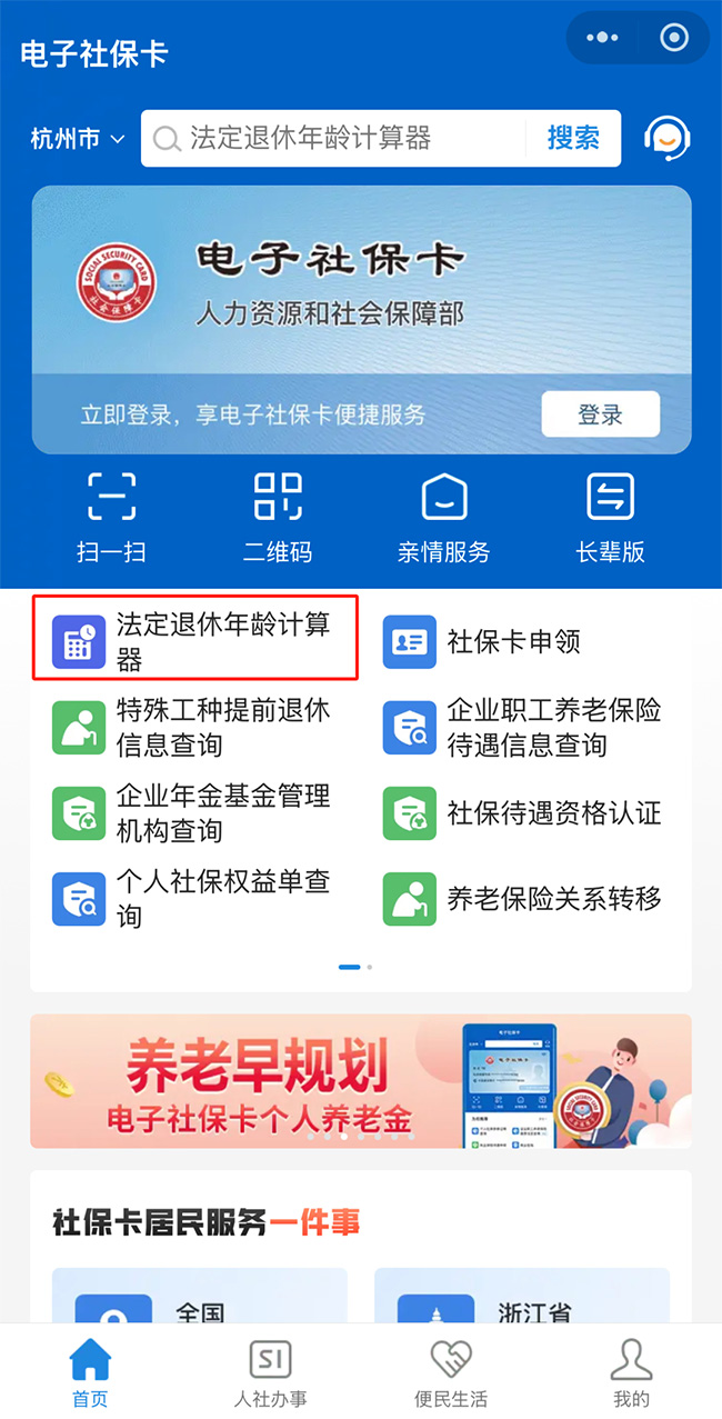 2、本人對應的法定退休年齡查詢 參保人員查詢本人法定退休年齡,可以通過4個人力資源和社會保障部的官方線上服務渠道查詢: (1)國家社會保險公共服務平臺; (2)全國人社政務服務平臺; (3)電子社保卡; (4)“掌上12333”APP。 通過上述途徑訪問“退休年齡計算器”,輸入本人的出生日期、性別等信息,即可查詢對應的法定退休年齡和退休年月。